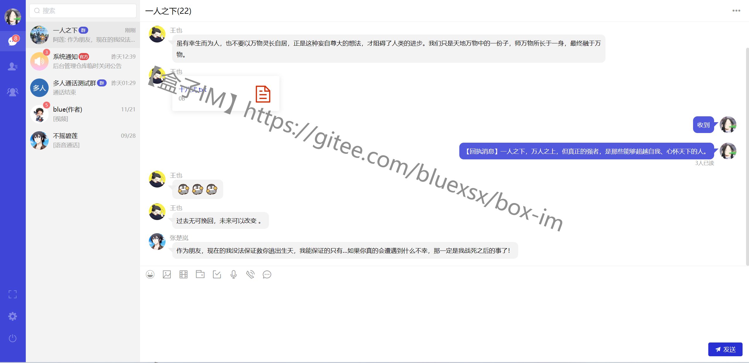 2. 支持私聊、群聊、离线消息、发送语音、图片、文件、已读未读、群@等功能