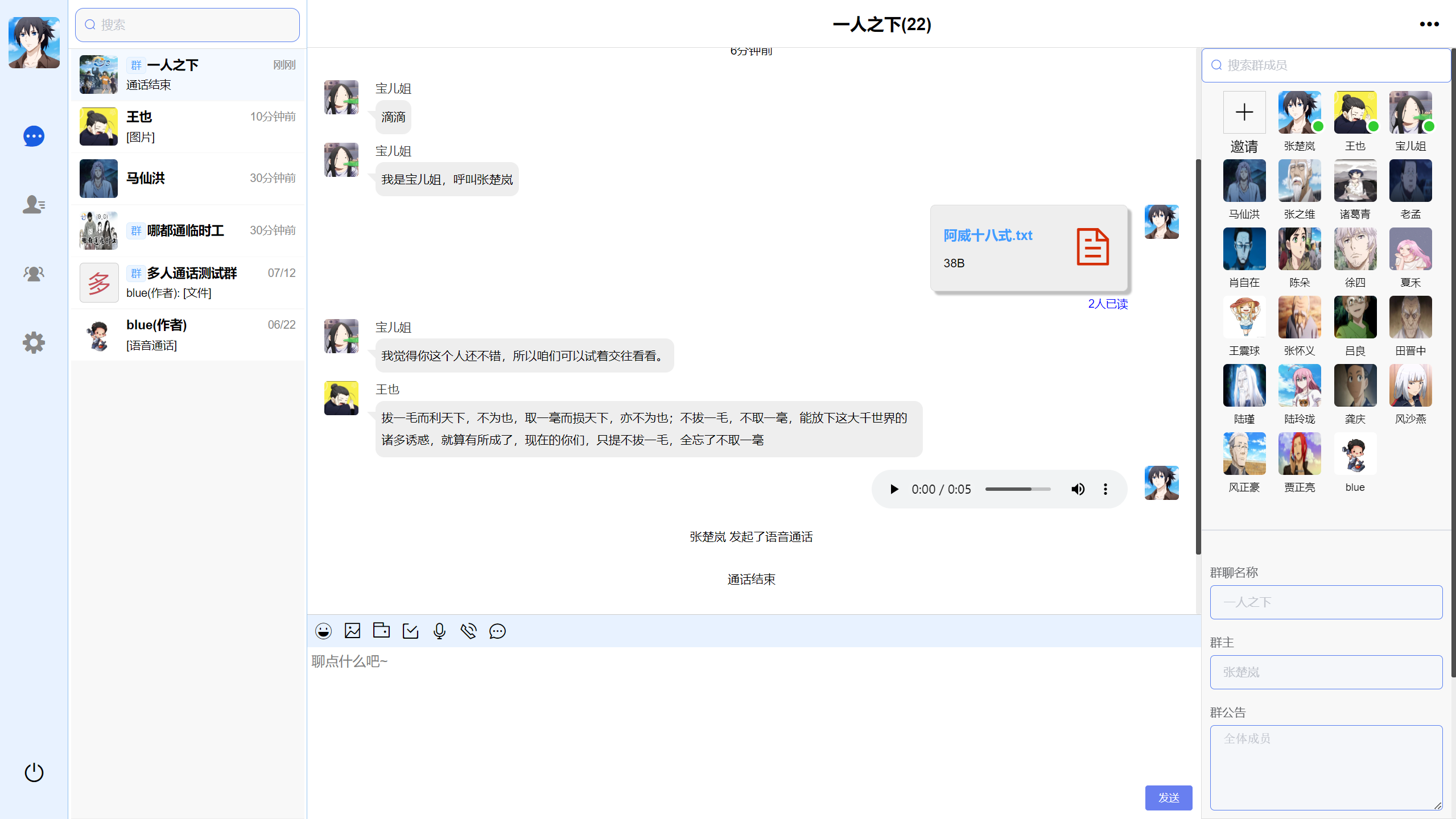 - 支持私聊、群聊、离线消息、发送语音、图片、文件、已读未读、群@等功能