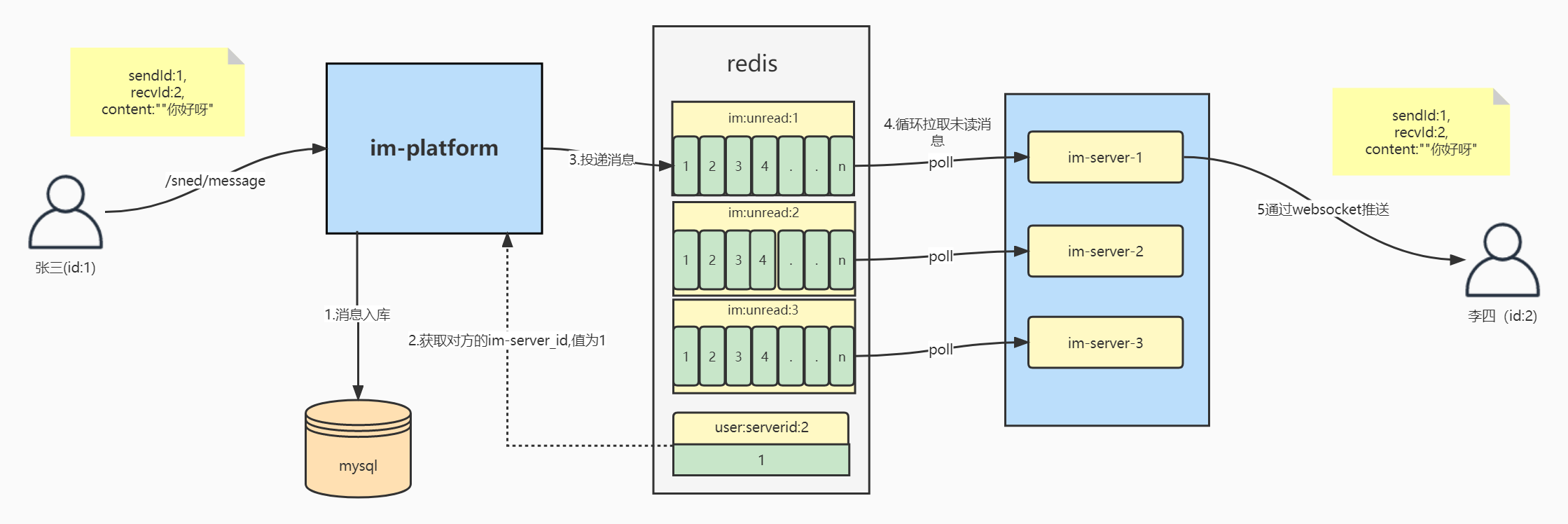 • redis记录了每个用户的websocket连接的是哪个im-server,当用户发送消息时,im-platform将根据所连接的im-server的id,决定将消息推向哪个queue