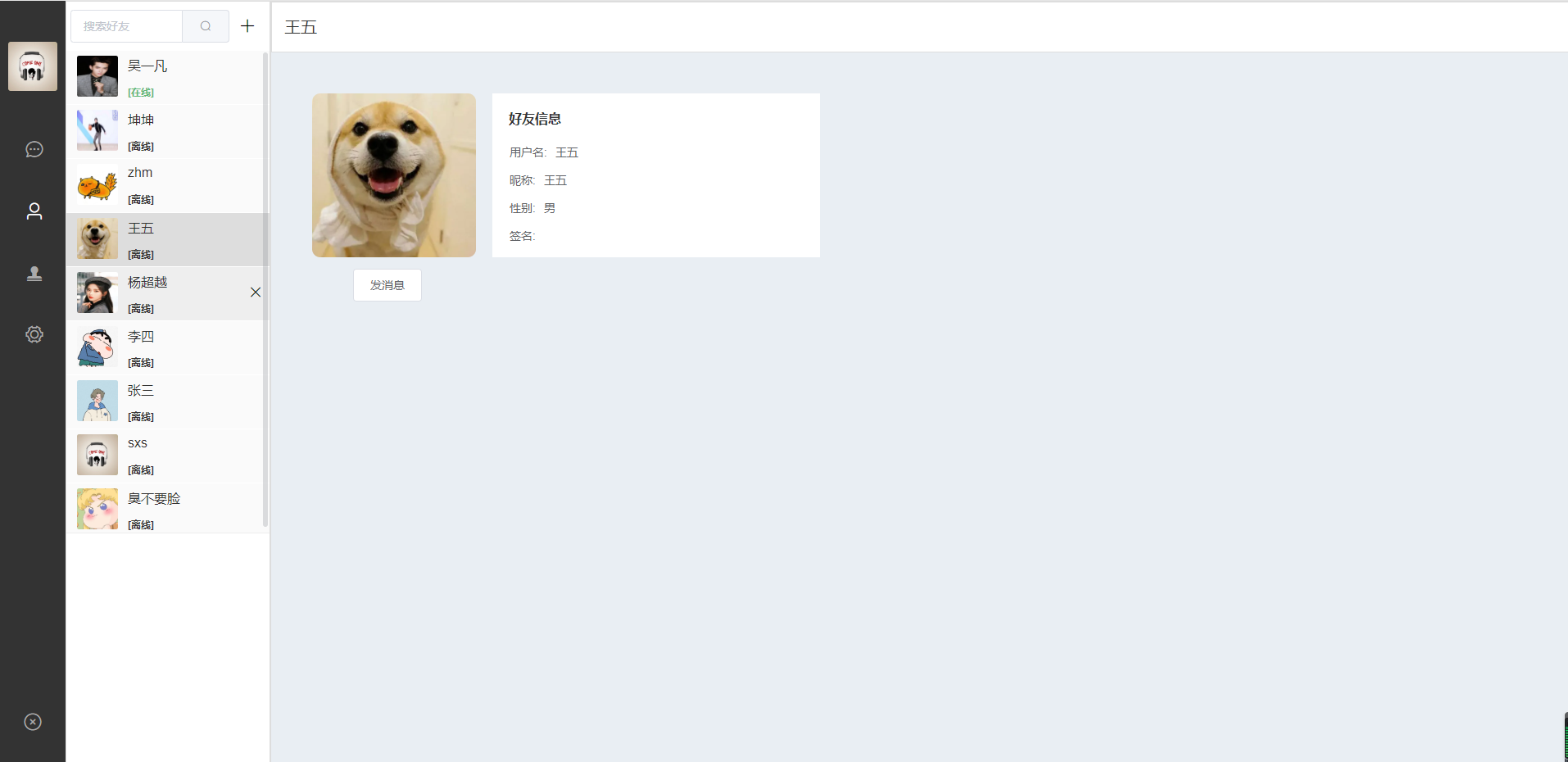 2. 支持私聊、群聊、离线消息、发送图片、文件、好友在线状态显示等功能。